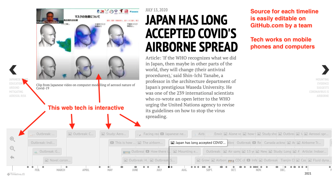 This site, its-airborne.org, has five interactive timelines to make our case for world recognition of this fact for COVID-19 and the rollout of airborne precautions after that. See them in the top☝️nav☝️of☝️THIS☝️page️. Here’s one as a pic with some explanation in red;